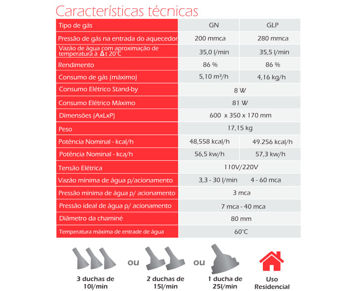 Vazão de 35,5 L/min, modelo “out door” – sem necessidade de proteção contra intempérie, controle digital da temperatura deslocável, auto diagnostico, sistemas de segurança integrados, exaustão forçada, permite a montagem em sistema “cascata”, 03 anos de garantia em uso residencial, fabricado no Brasil.